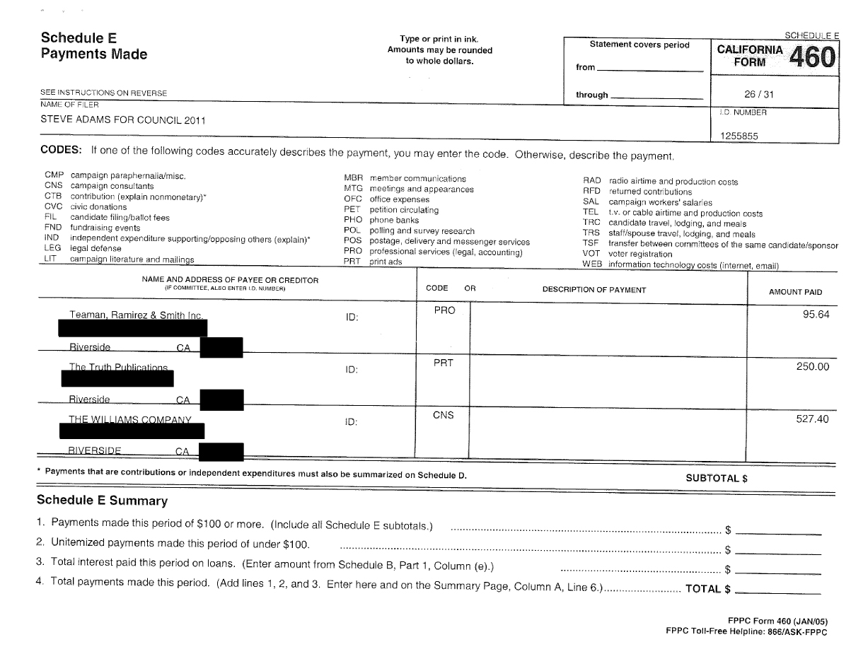 THE SITE CLAIMS THAT THE LAST PAYMENT COUNCILMAN STEVE ADAMS MADE TO THIS SITE FOR CAMPAIGN ADVERTISING PURPOSES WAS IN THE AMOUNT OF $440.00, BUT NOT IN ANYWAY INDICATED ON ANY 460 DOCUMENT FORM.