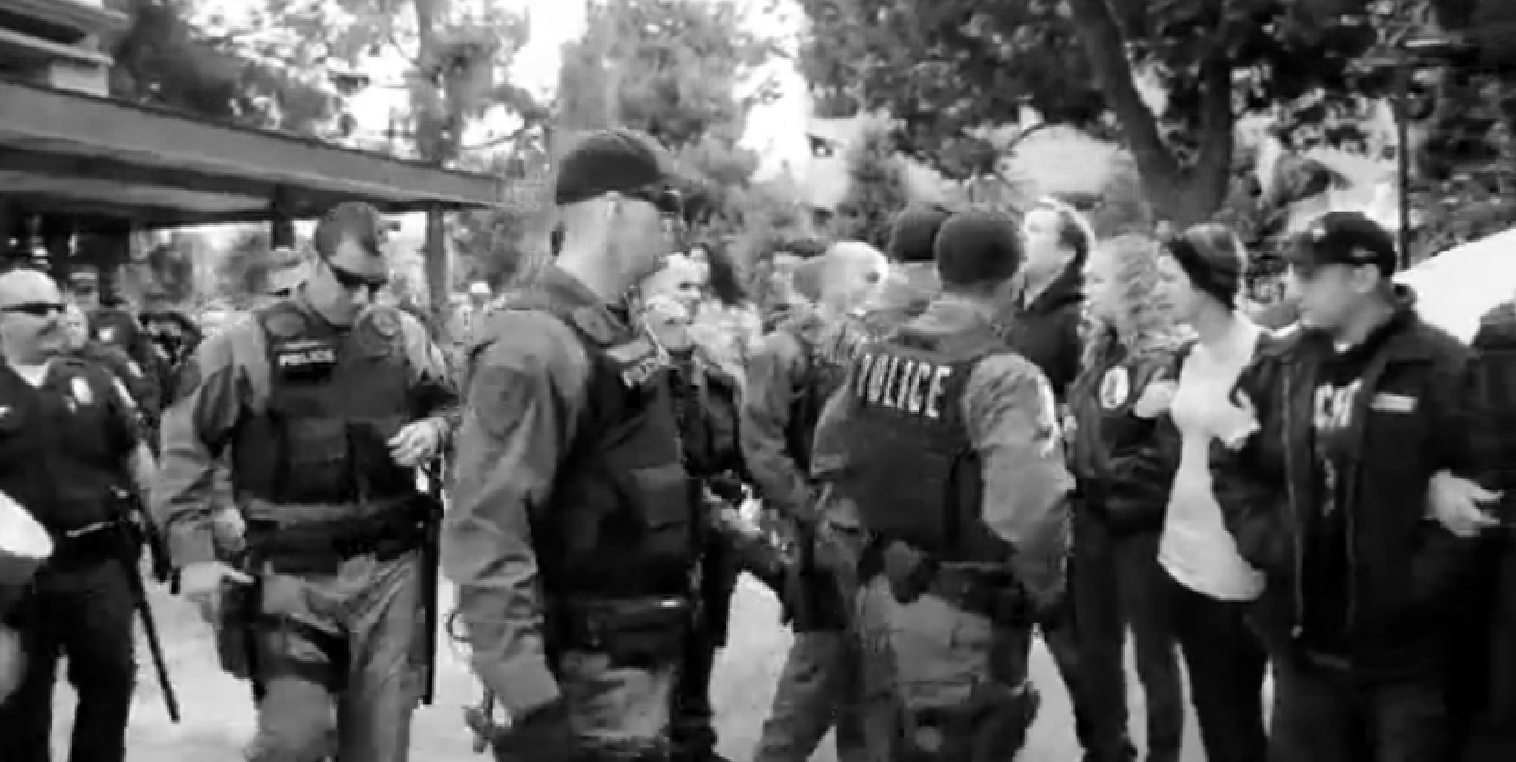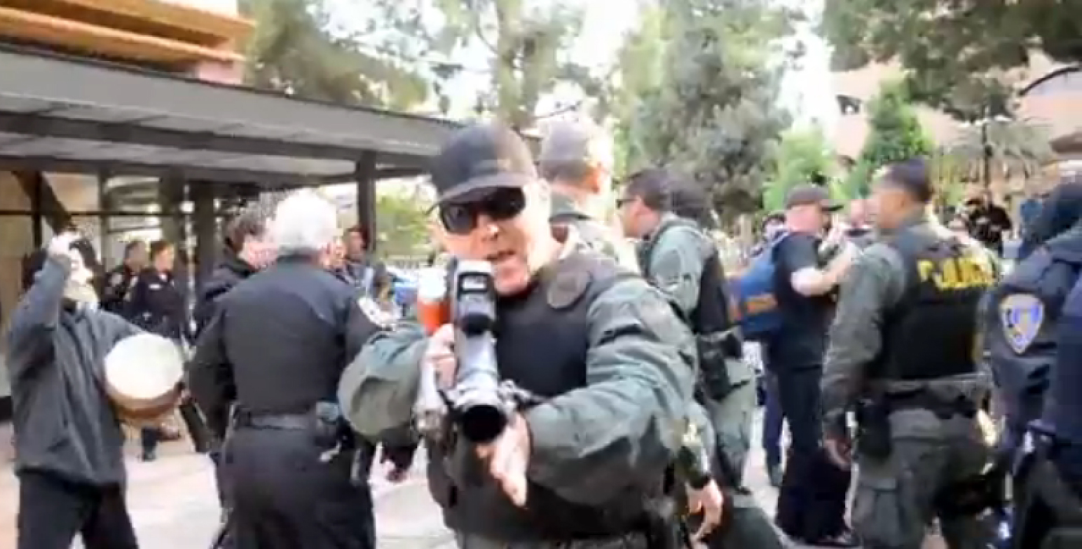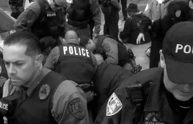 UPDATE: 11/07/2011: ACCORDING TO A REPORT BY CBS, THE ELEVEN PROTESTERS ARRESTED WERE CHARGED WITH ASSAULT WITH A DEADLY WEAPON, ASSAULT ON A POLICE OFFICER AND RESISTING ARREST ACCORDING TO JOHN CARPENTER OF THE RIVERSIDE POLICE DEPARTMENT.