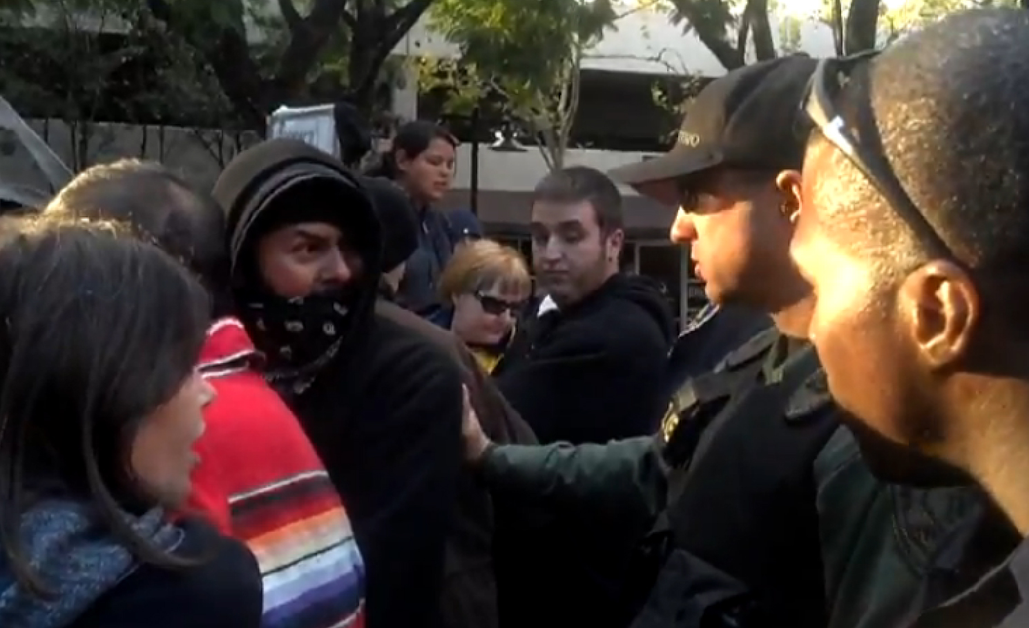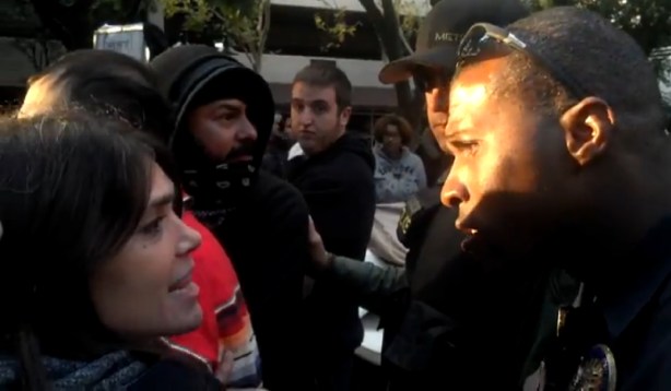 Occupier pleads with black police officer not hurt her friends in the chain.