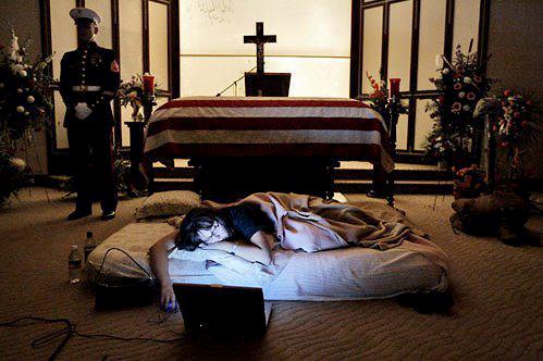 The night before the burial of her husband 2nd Lt. James Cathey of the United States Marine Corps, killed in Iraq, Katherine Cathey refused to leave the casket, asking to sleep next to his body for the last time. The Marines made a bed for her, tucking in the sheets below the flag. Before she fell asleep, she opened her laptop computer and played songs that reminded her of “Cat” (as he was called), and one of the Marines asked if she wanted them to continue standing watch as she slept.