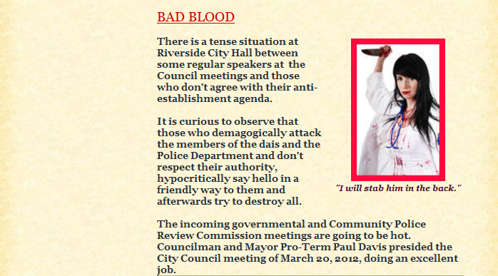TMC, RATED RIVERSIDE’S MOST “SLANDEROUS” AND MEZZSPELLED, “MISSPELLED” AND “OPINIONATED” BLOG SITE! TMC IS NOW EXCLUSIVELY ON FILE WITH THE COUNTY OF RIVERSIDE’S DISTRICT ATTORNEY’S OFFICE, AND PROSSIBLY POSSIBLY ON FILE WITH THE CITY OF RIVERSIDE’S POTENTIAL SLAPP SUIT LIST… WE WILL HAVE TO ASK GREGORY ABOUT THAT ONE… AGAIN, THANK-YOU COMMUNITY OF RIVERSIDE AND THE CITY OF RIVERSIDE EMPLOYEE’S FOR YOUR SUPPORT! COMMENTS ALWAYS WELCOMED, ESPECIALLY SPELL CHECKERS! EMAIL ANONYMOUSLY WITH YOUR DIRT OR FOR CONTACT! THIRTYMILESCORRUPTION@HOTMAIL.COM