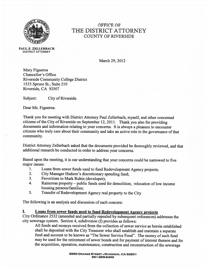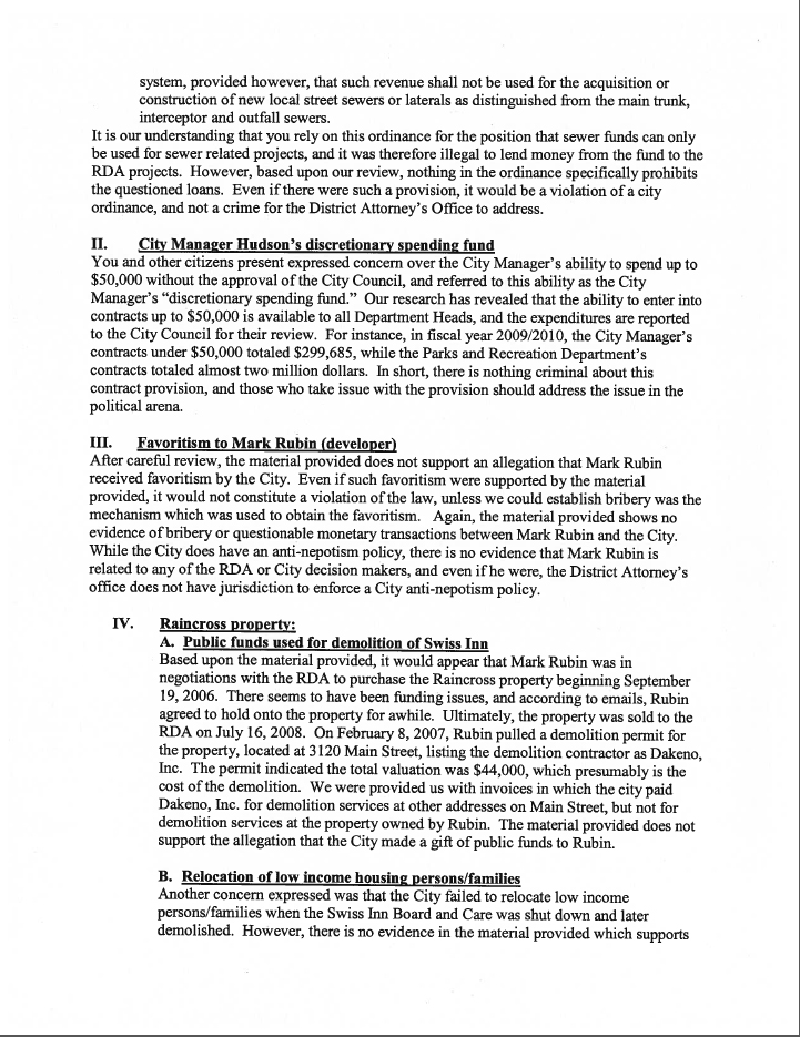 Response by DA’s office regarding favoritism by the City of Riverside toward developer Mark Rubin.