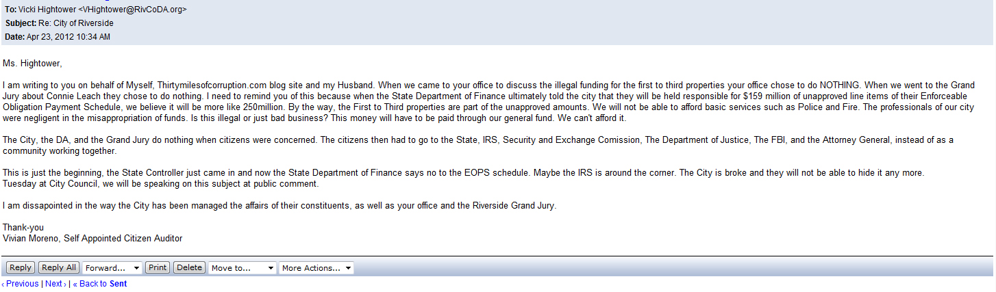 April 23, 2012 I wrote this email letter to the DA’s office to Vicki Hightower, Chief Deputy District Attorney, Special Prosecution Section, addressing concerns and frustrations.