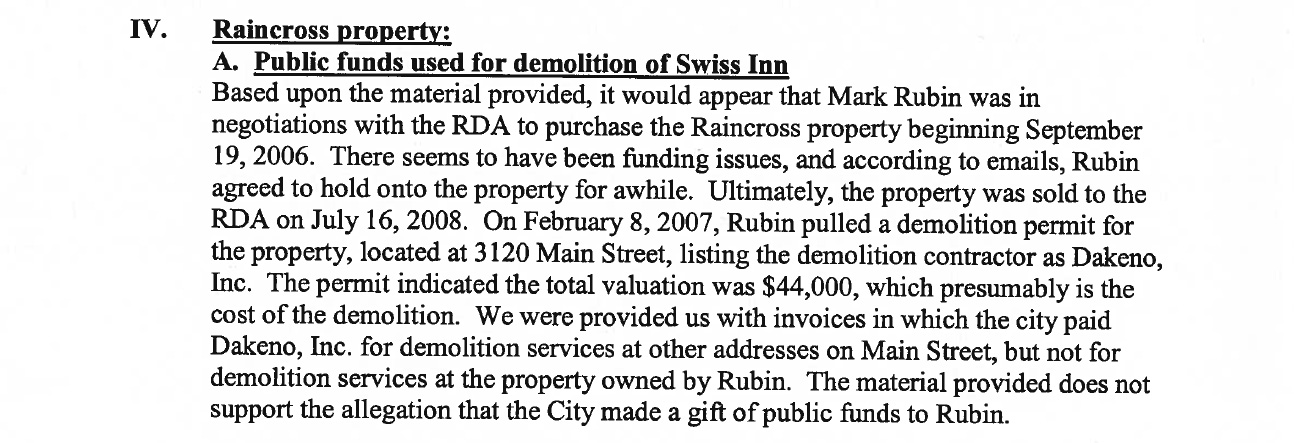 Response by the DA’s office regarding the demolition of the Swiss Inn, a Raincross property.