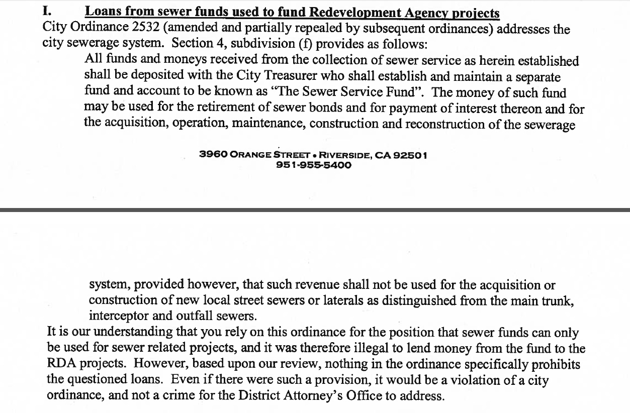 Sewer Fund Loans; not sure why the DA’s office is playing symantics with us, but the ordinance is very clear, it states exactly what these funds should be used for. It appears that the DA’s argument remains toward the premise that ‘nothing in the ordinance specifically prohibits the specified loans’. Bingo, that is also correct, there argument is that ‘nothing specifically states you can’t’. A DA diversion? But again the ordinance is very clear on what the funds should be used for. It states that such revenue (sewer) shall not be used for the acquisition or construction of new street sewers or lateral as distinquished from the main trunk, interceptor or outfall sewers. So therefore, why would monies from the sewer fund be transferred from a local City fund to a State Agency (RDA) in what is know as an ‘inter-agency” loan. When RDA is reflective of an agency of new construction, and the ordinance states this money cannot be used for new construction. The DA’s office went on to say that if there was such a provision, it still would not be a crime for the District Attorney’s office to address, because it would be a violation of the City ordinance. So who would be the appropriate source of contact for this concern? We have been told it is the DA’s office. We wouldn’t think for a moment that it could be the City. Whereby the city would investigate themselves on this violations. So the question remains.. Again, the DA’s office did not address the concern clearly, except to say that if there was not an ordinance saying you could not make a loan from the Sewer Fund., and of course this is also correct. There is none. But they didn’t consider the ordinance at its’ direct face value? In doing so, do ordinances, provisions and laws truly mean anything at all?