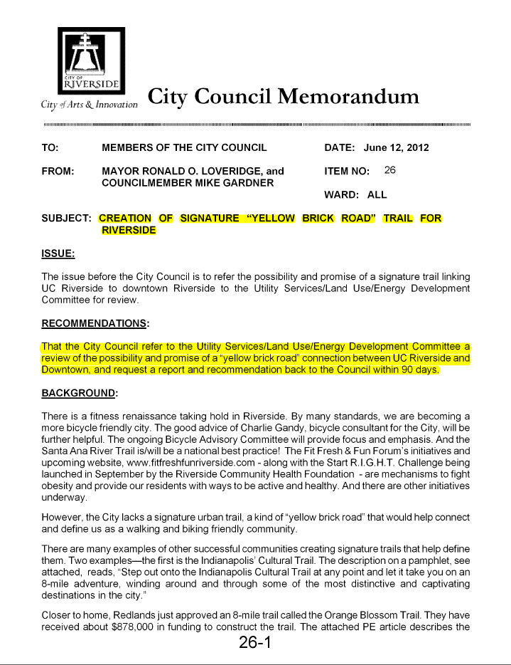 Passed on last week’s consent calendar is the creation of the signature ‘Yellow Brick Trail’, linking UC Riverside to ‘Emerald City’, of course, to our wonderfully blighted Downtown Riverside.