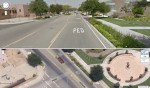 Accordingly the following image from the PE shows where Pablo was when she was hit (red tear drop). Also in the image are the lines of visual compromise to the police officer driving (red lines) which made it difficult to see Pablo. Also notice that where Pablo was hit (second image), was the area or distance between one vehicle lane. It is also important to notice the layout of the blocks in relation to the streets.