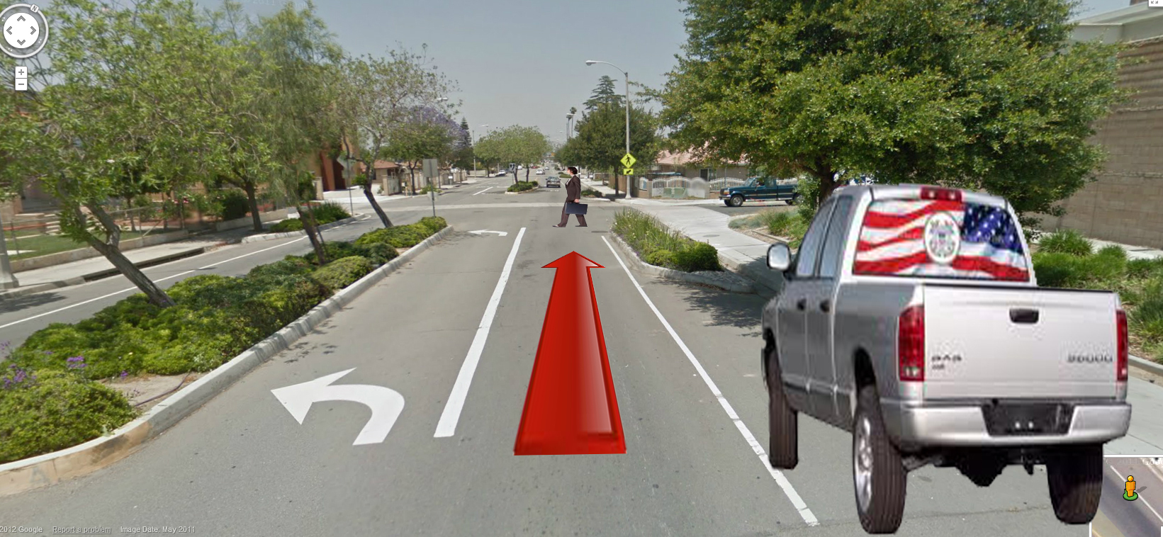 Three other views beginning approximately one quarter of the way to impact. Keep in mind the view especially in image three. Also consider as indicated by the PE, the landscaping, medians and planters were installed in a $1.1 million project in 1999 that was designed to slow vehicle traffic and make Madison more pedestrian friendly. Image four is of Image Two with a parked truck.