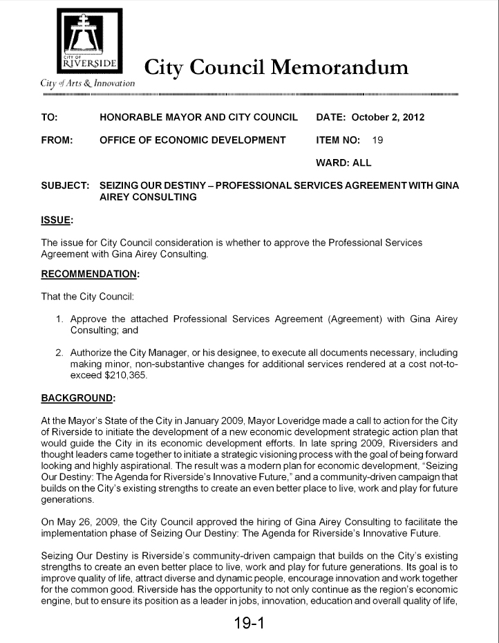 UPDATE: 10/01/2012: ITEM # 19 ON CITY COUNCIL AGENDA FOR 10/02/2012: GINA AIREY CONSULTING TO BE CONTRACTED FOR “SEIZING OUR DESTINTY TWO”? AT A COST TO THE TAXPAYER OF $210,365.00? Yes Folks, there is a Method in the Magic in order to initiatate Seizing Our Destiny Two..