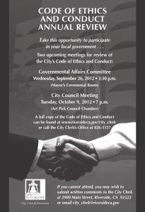 UPDATE: 10/05/2012: DO NOT FORGET THE CODE OF ETHICS REVIEW AT TUESDAY’S CITY COUNCIL MEETING, 7:00PM, OCTOBER 09, 2012. A FULL COPY OF THE CODE OF ETHICS AND CONDUCT CAN BE FOUND AT WWW.RIVERSIDECA.GOV/CITY_CLERK