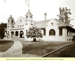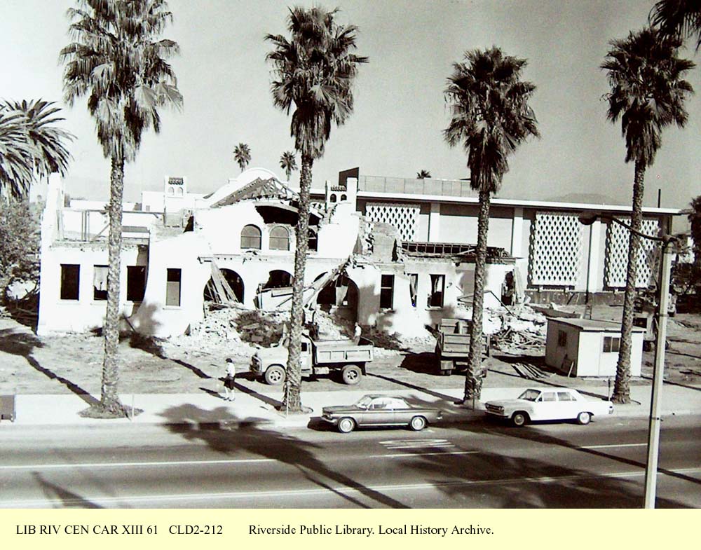 RIVERSIDE’S CARNEGIE LIBRARY, CIRCA 1903-1964, NEW LIBRARY SHOWN BEHIND DEMOLITION.