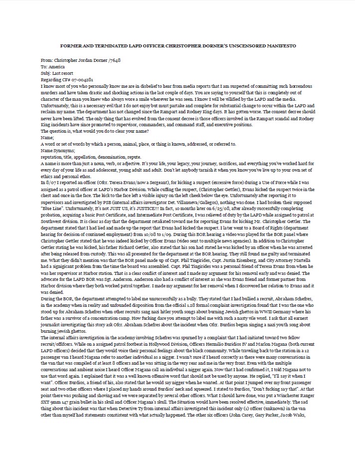 FORMER AND TERMINATED LAPD OFFICER CHRISTOPHER DORNER’S UNSCENSORED MANIFESTO