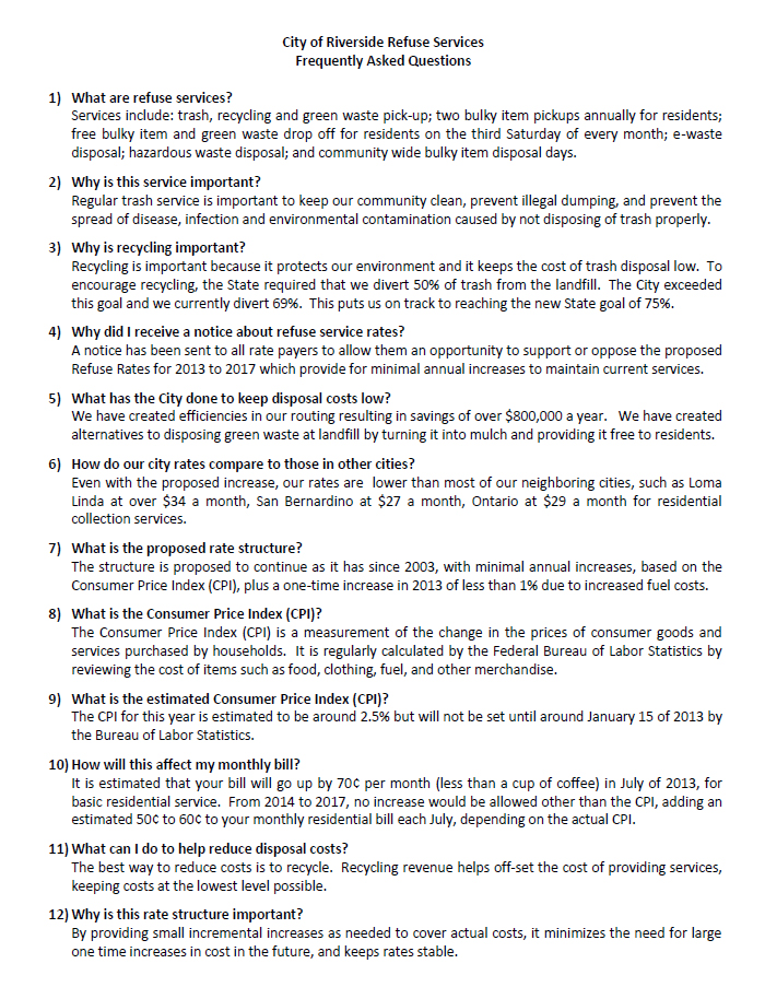 What appeared to be snuck in and sent to residents over this past holiday weekend, this mailer sent by the City of Riverside Public Works detailing their intent to raise your trash rates.  Simply saying that the rate for 2013 to 2014 will be raised $0.16 + CPI ( Consumer Price Index).  Will the CPI charge be $1.00 or $10.00?  Currently the rates for curbside pick up is $21.77.
