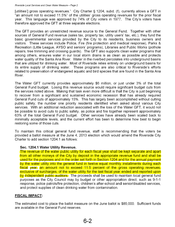 The City of Riverside has described that this General Fund Transfer from the Water Fund was voted on in the years of 1908, 1968 and 1977. This all true, we make no bones about it, but one of the discrepencies the City fails to make public, is when Proposition 218 was voted on by the taxpayer in 1996 by an overwhelming 84% of Californian’s, this made the transfer illegal, even for charter cities such as Riverside. So when our Mayor Rusty Bailey states that Proposition 218 doesn’t affect charter cities, he is not being correctly informed, or he has not read the document. Proposition 218 described that a new General Fund Transfer (GTF) from the Water Fund must be brought to a vote to the people. That was never done, until the Moreno’s challenged the city by filing the law suit. Further, if this GTF is approved by the people, as in the current Measure A. If passed, according to Proposition 218, cannot be used for City Services, but must solely be used for Water related purposes with precision accounting of the monies. Specifically, page 50, Propostion 218 states very clearly. But the City and others, such as the Raincross Group, a highly intellectual and distinguished group, continue to encourage residents to vote on an illegal measure. I would imagine Tom Evans, a former City of Riverside Public Utilities Director, would be well versed in Propostion 218. This shocks me, but at the same time it doesn’t, especially when the city has been taking monies illegally since 1996, and with premeditaion.