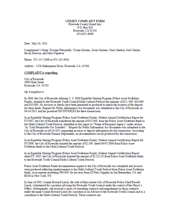 When the Grand Jury was doing it’s investigation into the Connie Leach case, both Mary Figueroa and Dvonne Pitruzzello had been interviewed. Pitruzzello told the Grand Jury that the person you want to talk to is Vivian Moreno, this was beacause she did the majority of the investigative research and was fully knowledgeable of the events that occured. Moreno was next in line to be interviewed and the Grand Jury had just submitted a multitude of document request from the City of Riverside. The investigation was suddenly squashed a couple of weeks later by a letter sent to Figueroa stating the investigation was unfounded. Though to this day, their has not been a formal investigation of the findings and a conclusion submitted online. Why hasn’t this occurred? Was there a cover up or a failure of the current DA to take on what could possibly be an embarrassing event in his own back yard? The following is the original complaint submitted to the Riverside Grand Jury back in March 2011.