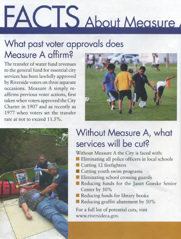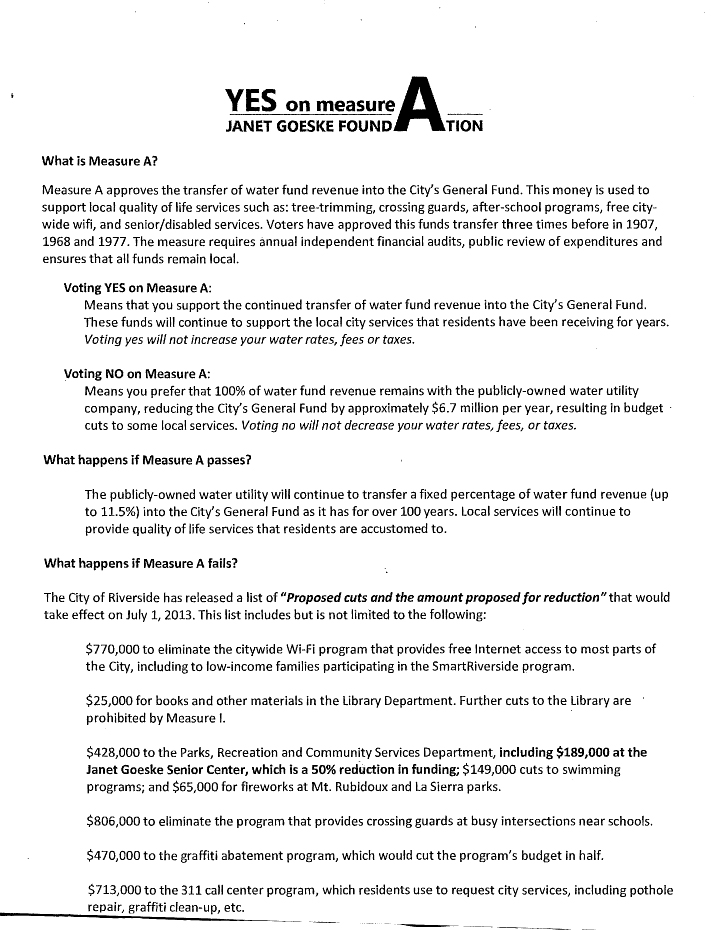 State Water policy conflicts with our constitution and law if you apply it in an area like Riverside as our city is doing. Instead, our city wants to put the cost on our water bill under the guise of following state water conservation policy. This increases the cash flow of water sales and Measure A sweeps more money into the general fund every month. Increases in utility rates, fees and charges will always send more cash to the general fund. This is why we, the current residential utility customers of Riverside are subsidizing the infrastructure investment to prepare the city for future growth. We are being scamed.