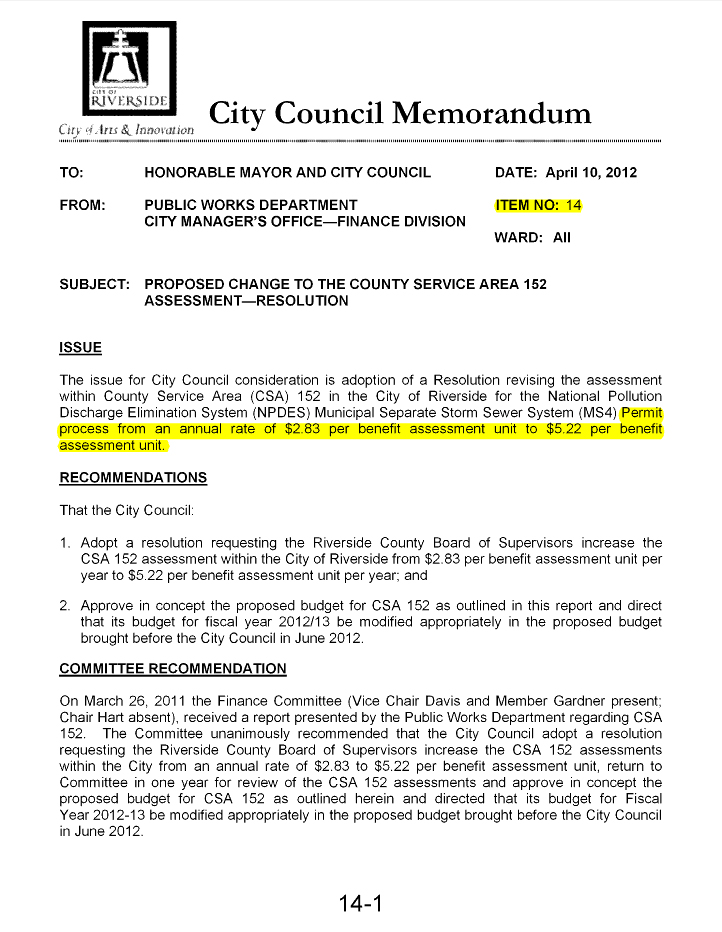 In the City of Riverside the resident continue to double and triple pay for services they should receive through their property taxes. This is only one example, but we not only see it in street sweeping, but in tree maintenance, parking, utility rates etc.