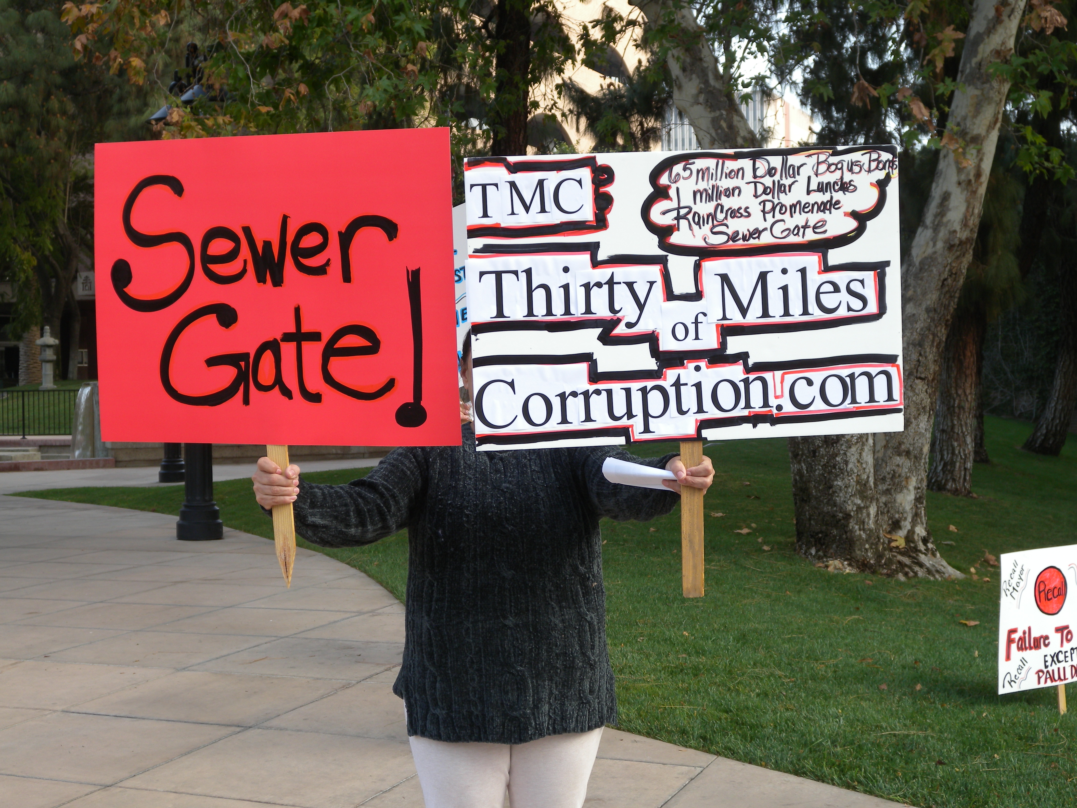 TMC’s support of State Controller John Chiang’s Auditing Team started the morning off with protest signs facing incoming city workers. Protest involves the alleged fraud and misuse of Obama’s Federal Build America Bonds by the City of Riverside. Whereby, bonds intended for one purpose or project, is diverted to other unrelated purposes. In the midst of taxpayer abuse as seen with California Cities such as Bell, Montebello and Hercules which have resulted in millions of dollars lost. Local community residents have raised the questions of the sanctity of the city’s finances as well as their expenditures. Concerns of increase power, water, sewer rates along with incidental service fees to get around proposition 218 to cover cost of mismanagement have been prevalent. Now with the City of Stockton, California on the brink of filing for bankruptcy, attention is high. TMC request the auditing team to dig further. “Seek and you will find”.. Join us in voicing your opinion in front of City Hall and at todays City Council Meetings, Afternoon session 3:00 pm and Evening session 6:30 pm. According to the PE the auditing team will be in the City of Riverside for a two month routine evaluation, of one project, the Columbia Grade Seperation. TMC questions the length of time necessary for one project to be evaluated.