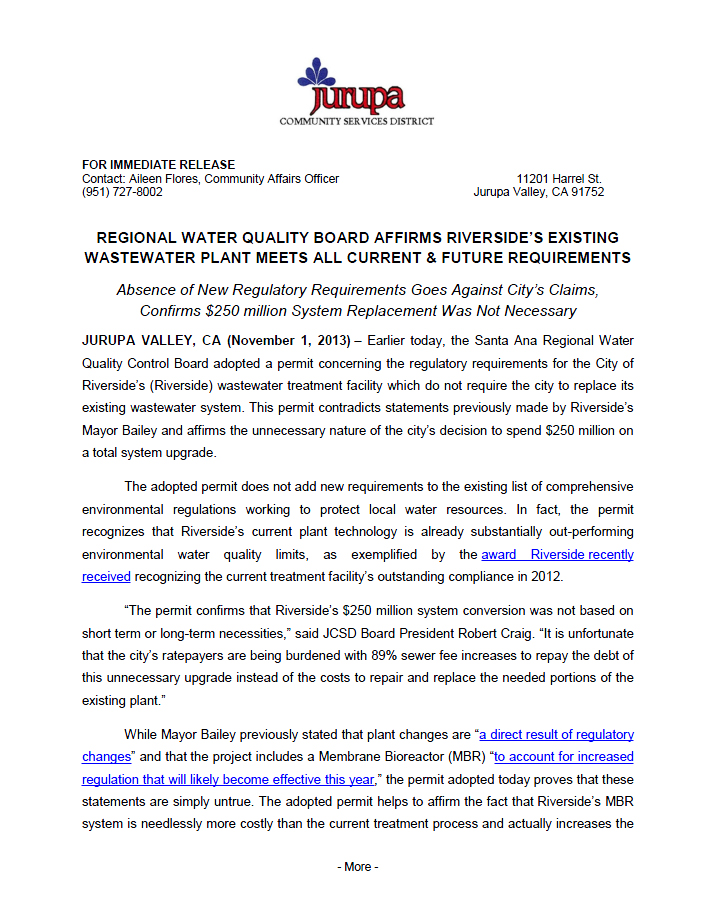 REGIONAL WATER QUALITY BOARD AFFIRMS RIVERSIDE’S EXISTING WASTEWATER PLANT