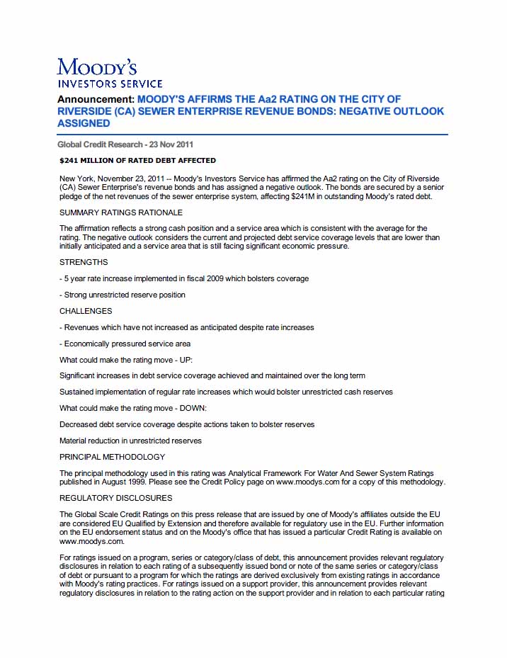 Another concern S & P argued was the application of large cash reserves to soften (lessen) rate increases. According to S & P this is an acceptable practice in most cases, though the degree of subsidization in the City of Riverside, historically (the city’s track record) and as projected (forecasted) for the next few years, in S & P’s viewpoint, appears “aggressive.”