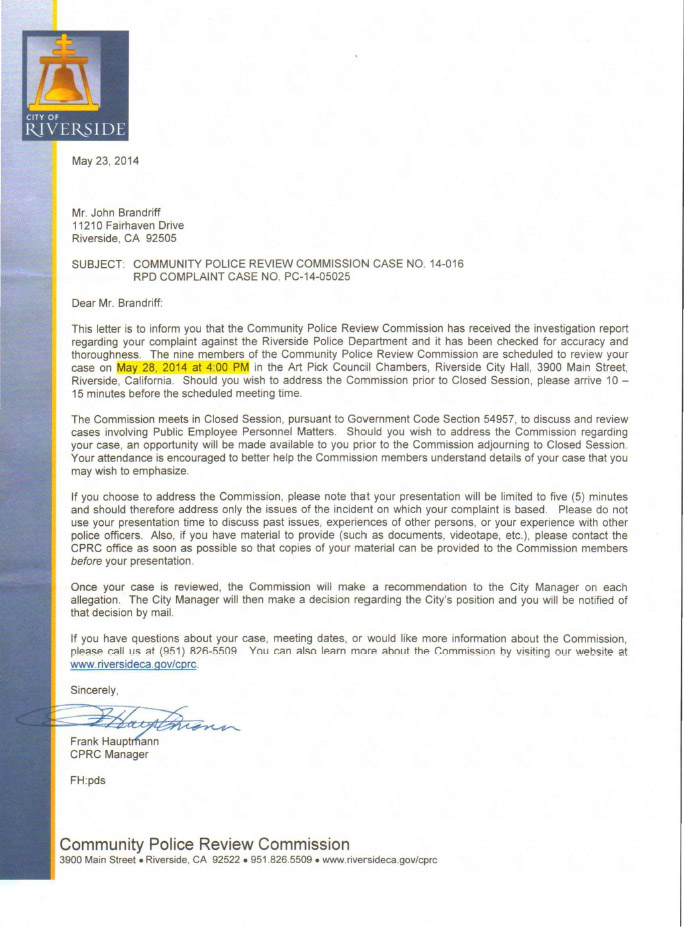 TMC was notified earlier today that John Brandriff’s complaint against Chief of Police Sergio Diaz has forwarded to the Community Police Review Commission (CPRC) for review. We believe that this is the first time we’ve ever heard of a Human Resources complaint being directed for review by the City Manager. Usually, the Human Resource Department in conjunction with City Manager would make a decision based on the merits of the complaint. Would this be a way for City Manager Scott Barber not to deal with such a “hot” issue? In past posting on TMC, we stated that the investigator who reviewed the complaint found that both Brandriff’s and Diaz’s story which unfolded that evening, were consistent. This case will be reviewed tomorrow Tuesday, May 28, 2014 at 4:00pm in the Art Pick Council Chambers at City Hall. The public is welcomed to attend.