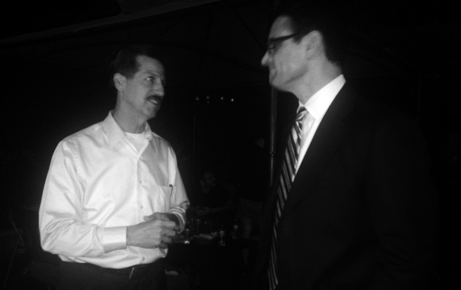 Riverside Councilman Mike Soubirous seen speaking to the newly elected District Attorney, Mike Hestrin at the election night party.