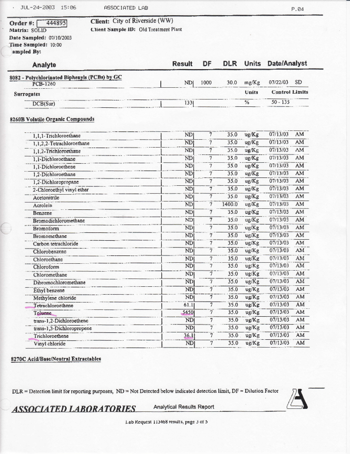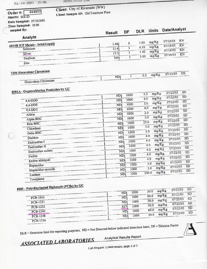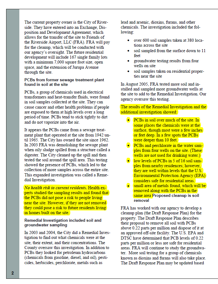 Compare the Result with the DLR (Detection Limit for purpose of Reporting)-below the DLR is acceptable, over is unacceptable. The below December 2005 Fact Sheet Cleanup Proposal states that as a result of the contaminant findings, that there are no health risk to current residents, however, they can pose a risk to future residents living in homes built on the site… You be the judge, we’ve had City workers who have died working on the cleanup, we’ve had resident reports surrounding the untouched properties who claimed illness.
