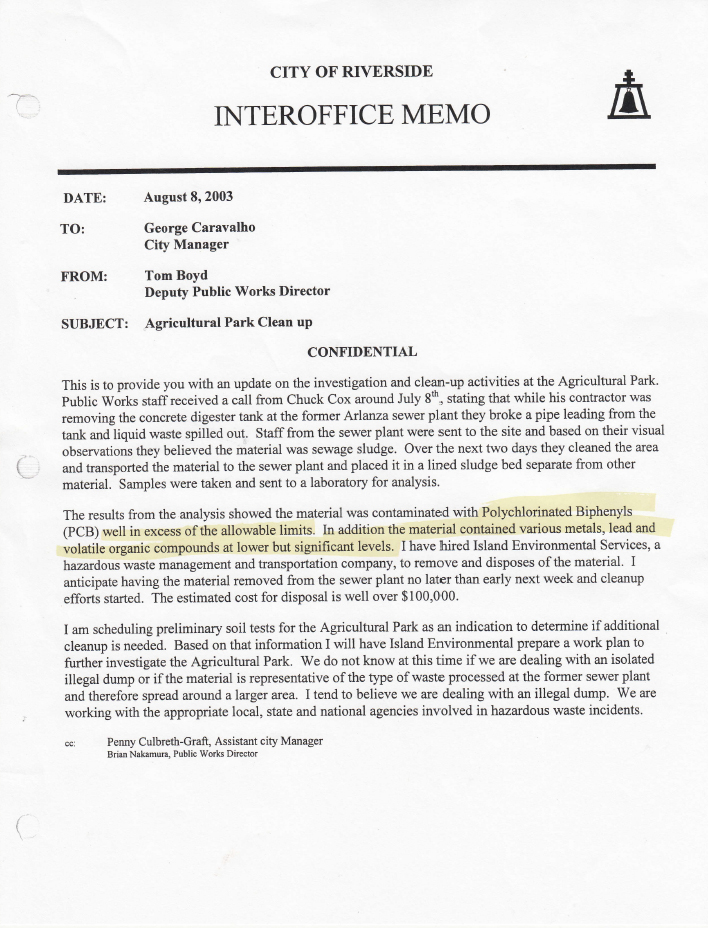 The following is a 2003 Interoffice Memo from Public Works Director Tom Boyd, then deputy public works director, to former City Manager George Caravalho, reporting the breakage of a digester tank which spilled its contents, and the intended clean up plans. Later, lab analysis determined the spilled contents to contain high amounts of PCB’s (Polychlorinated Biphenyls) as well as other dangerous contaminants, as indicated below: