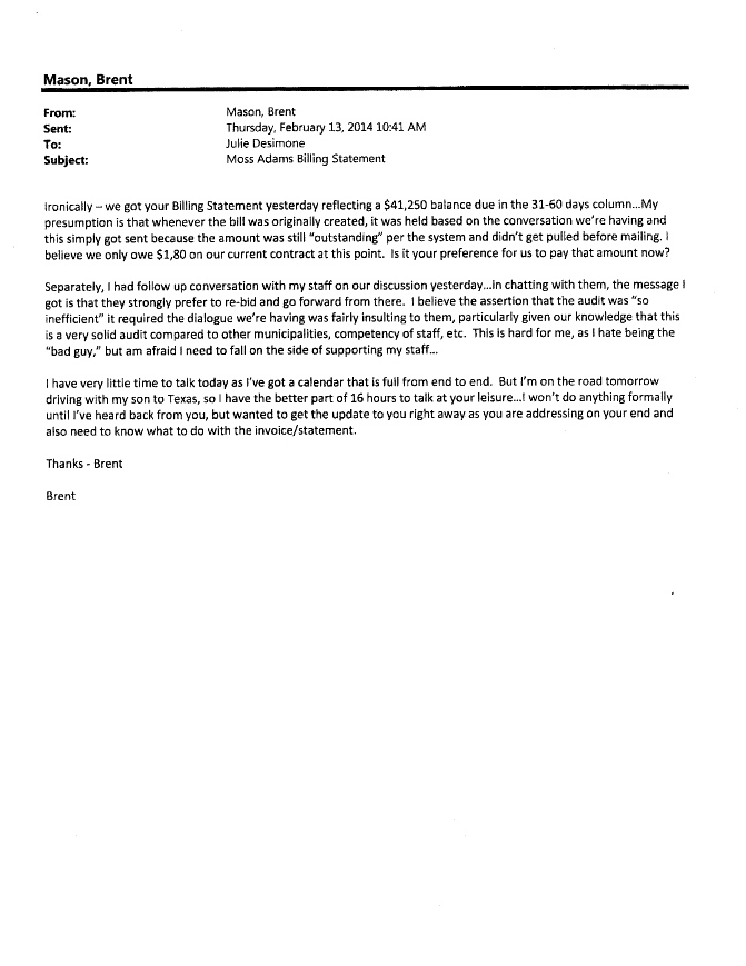 The firing of the accounting firm of Moss Adams mid contract raised questions as to why? Per public request act, we asked for the emails of all correspondence between Moss Adams and Chief Financial Officer Brent Mason. The first, shows what appears to be a rather annoyed Brent Mason, when responding to Moss Adams billed amount of $41.250 to the City of Riverside. Mason responds by questioning the $41,250.00, and states his current records shows the City to owe $1.80. Mason ask if Moss Adams would like the $1.80 paid immediately? Did Moss Adams offend Mr. Mason?