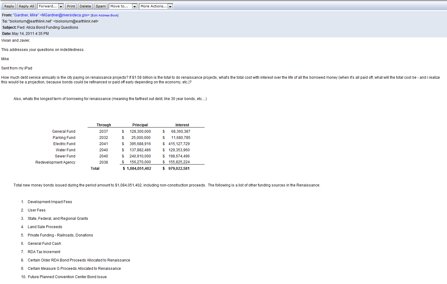 WHAT WAS MORE REVEALING WAS THE CITY OF RIVERSIDE’S DEBT SERVICE OVER THE NEXT 30 YEARS.. TO THE TUNE OF $2,063,073,983.00 WHICH IN LAYMAN’S TERMS IS $2 BILLION! What was also stated by Councilman Mike Gardner, is that we, the City of Riverside, has a “baloon” payment due in 2014! What does this mean? It means that we have to come up with with close to a $100 million, which according to Gardner, will have to be refinanced. With are downgrade in sewer bonds from a AAA rating to a A rating, this will definitely effect are ability as a city to refinance anything!