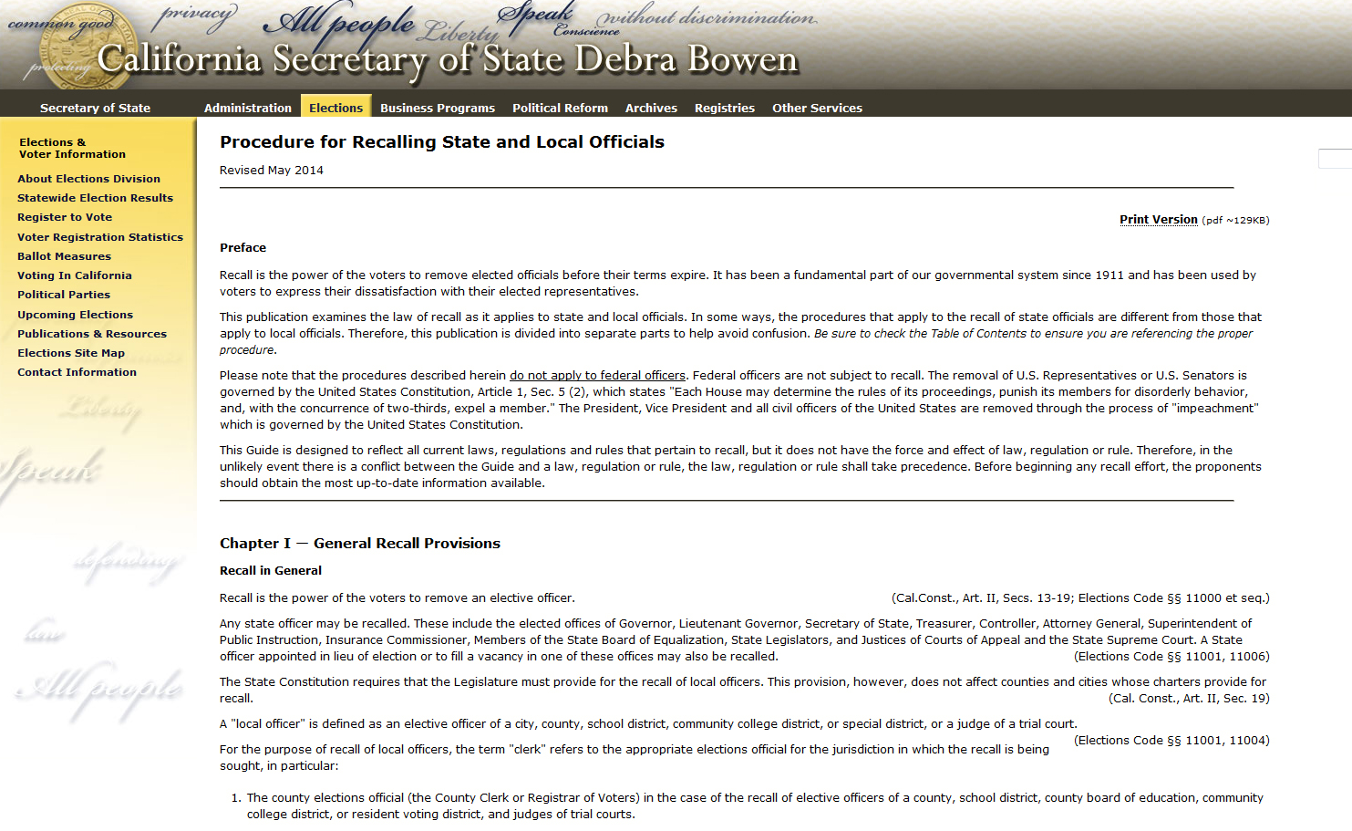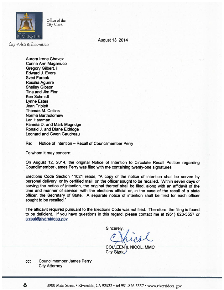 UPDATE: We are attempting to clarify issues with regard to the Perry Recall. Prior to the recall, meetings were appointed with City of Riverside, City Clerk, Colleen Nichol as to the process of a recall. Be it known, to be the first time in the history of the City of Riverside to occur. Corroborations with the Registrar of Voters also occurred to clarify proceedings. We will keep you posted. The letter below is from City Clerk Colleen Nichol regarding the proponents failure to file a signed affidavit from the server and other paper work. Questions arose as proponents believe that the letter was prematurely sent to the Alicia Robinson of the Press Enterprise. According to State Law, allows 7 days to file after serving. On Tuesday 12, 2014 at City Council, City Clerk Colleen Nichol’s was present at the time of service of recall papers to Councilman Perry. Nichol’s accepted the packed with no response of any inaccuracy to proponents. We will keep you updated.