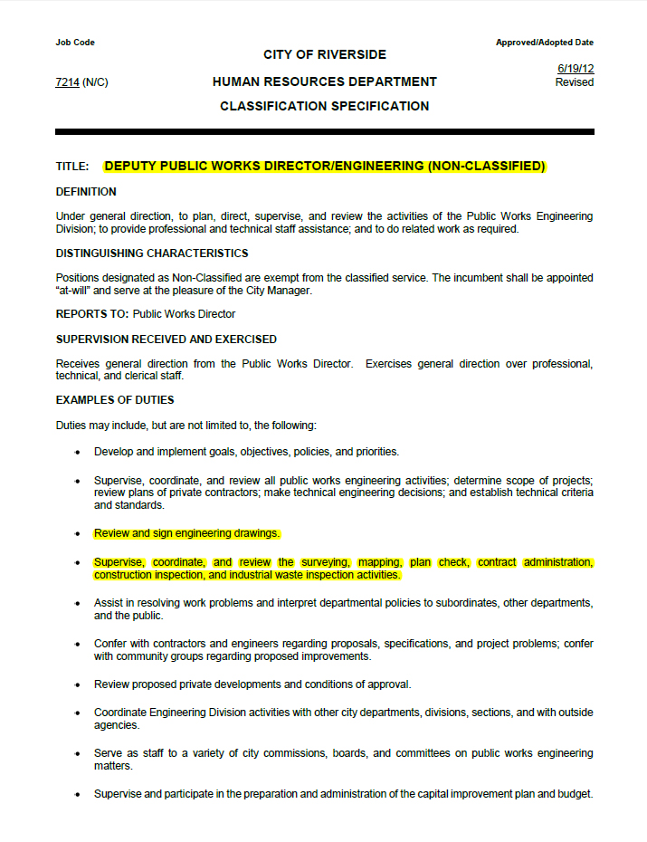 2. Must Supervise, coordinate , the surveying, mapping, plan check, contract, administration, construction inspection, and industrial waste inspection activities.