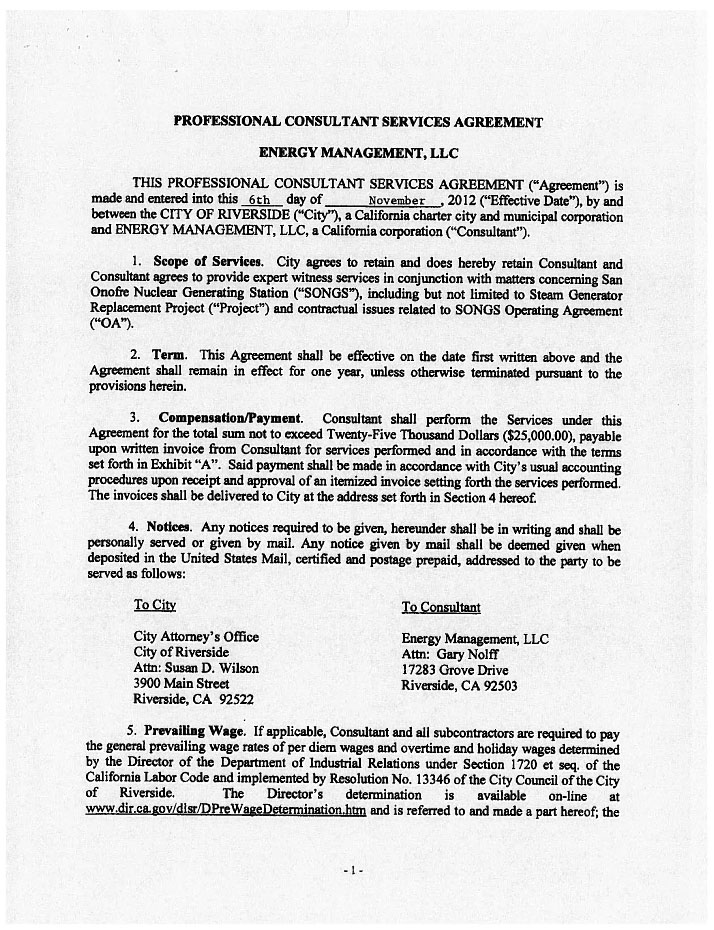 Mr. Nolff was even given an office courtesy of Ms. Kerr from which to perform his duties: to perform the role of caretaker during the decommissioning (shutdown) phase of San Onofre Nuclear Generating Station. You see, the darn steam generators there, which were only a few years old at the time, just didn’t seem to want to work correctly, and that’s a bit of a problem when you’re dealing with radioactive material we’re told. Of course, Mr. Nolff was an expert in that particular arena: he had been instrumental in getting Riverside to sign onto buying the malfunctioning units in the first place while we employed him full-time. Now that’s what we at TMC call job security! By some estimates the total cost of that failed San Onofre deal to the ratepayers was about $90 million. Thank you Gary Nolff!