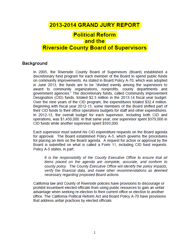 According to the latest report released by the Grand Jury on July 2, 2015, they believe they were retaliated against by the Riverside County Board of Supervisors, when on April 8, 2014, the 2013-2014 Riverside County Grand Jury made public a report entitled, “Political Reform and the Riverside County Board of Supervisors”. This report focused on the use of Community Improvement Designation (CID) Funds and was critical of the way some of the funds were utilized.