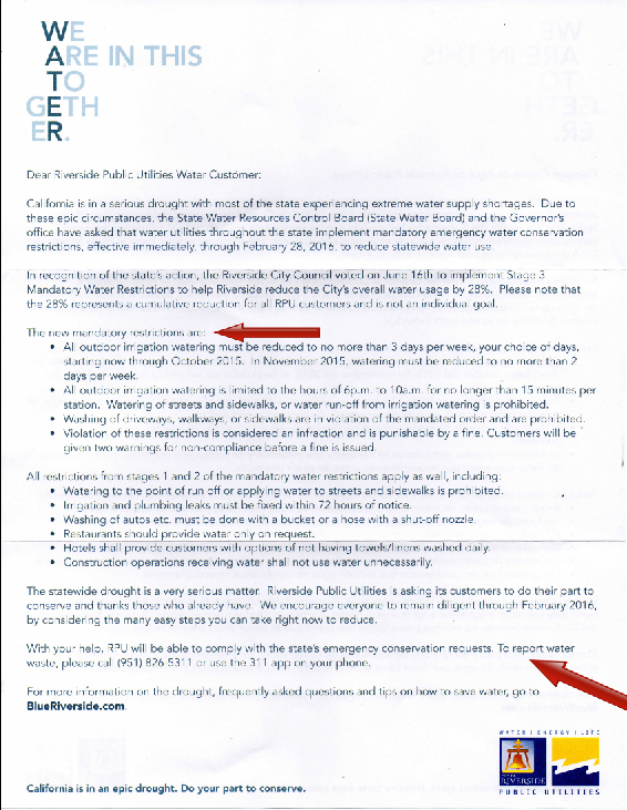 Riverside is unique in that we own our water. Twenty percent is sold to outside locals. So why are we conserving, while the city is mandated by law to harvest “x’ amount of water from the Bunker Hill Basin or lose those rights! New City Attorney Gary Geuss file a lawsuit on behalf of the public asking the State to reverse their requirements since we own our own water. What he forgot to tell the State is that the City has a “contractual” association with the homeowners that requires them to provide water. What this means is that it trumps the State Water Drought Declaration. More on this to come. What’s more egregious is that the city of Riverside is asking their residents to be “snitches” on their neighbors concerning the new restriction, which will of course cause further undo tension and discourse in the community…for absolutely no good reason.