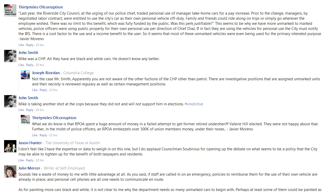 When the second article was released, actually written by Soubirous, some individuals were stating that Councilman Mike Soubirous was only bringing this up because the Police Unions didn’t support him and he was vindictive. What we do know from City employees and observation is that Diaz does not handle criticism well, may be the reason why he was not promoted to the next level at LAPD. But maybe Diaz was a bit to close to RPOA. Specifically with RPOA President Brian Smith. We saw this dance take place whereby the two including former City Manager Scott Barber attempted to railroad Soubirous on trumped up charges. In reality, what we saw was a coups d’état, with law enforcement creating a false scenario in order to remove power from one individual, Soubirous, because their candidate, undersheriff Valerie Hill didn’t win. Extremely dangerous in a Democracy, but is the City of Riverside just seen by insiders as a “Banana Republic?” Easily taken over at a whim, because no one is watching? We also know that RPOA donated a heap of money to the Hill campaign, of course less than what was embezzled. What Diaz didn’t mention but Soubirous did was the following. Last year, the Riverside City Council, at the urging of our police chief, traded personal use of manager take-home cars for a pay increase. Prior to the change, managers, by negotiated labor contract, were entitled to use the city’s car as their own personal vehicle off-duty. Family and friends could ride along on trips or simply go wherever the employee wished. There was no limit to this benefit, which was fully funded by the public. Was this perk justifiable? I don’t think so, again if this is not reported to the IRS, there is “fraud” involved, and Diaz should know everything about the term “fraud.”