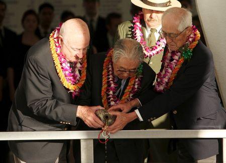Dr. Hiroya Sugano(c), former World War Two B25 bomber pilot Jack DeTour(L) and former World War Two Japanese fighter pilot Shiro Wakita pour bourbon whiskey into the “Remembrance Well” aboard the USS Arizona Memorial during the “Blackened Canteen” ceremony honoring the 74th anniversary of the attack on Pearl Harbor at the World War II Valor in the Pacific National Monument in Honolulu, Hawaii December 6, 2015. REUTERS/Hugh Gentry