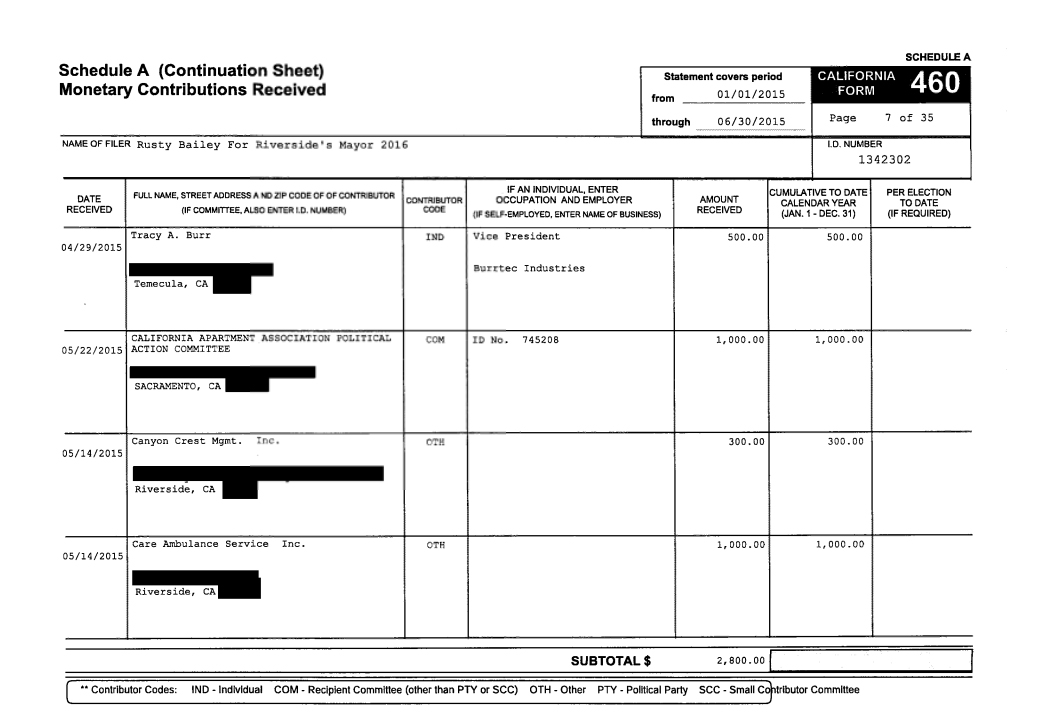 EVEN RUSTY BAILEY RECEIVED CAMPAIGN CONTRIBUTIONS FROM COLE BURR OWNER OF BURRTEC WASTE, BUT WASN’T QUITE SURE.