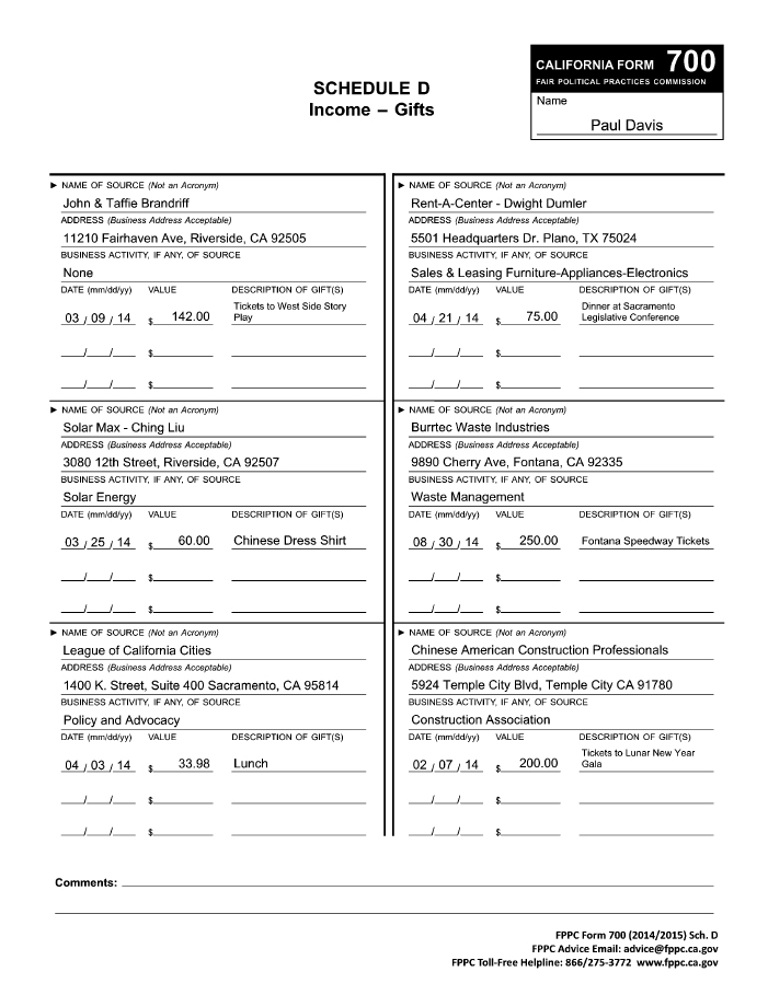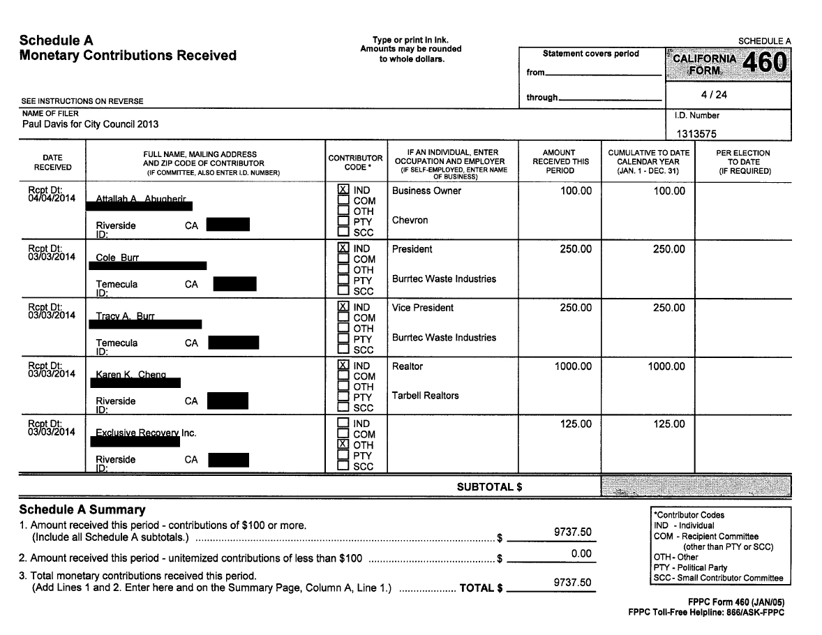 1. I stated Mr. Davis wanted to privatize trash haulers and he would give Burrtec the contract because Burrtec is a contributor to his campaign: Paul Davis stated very clearly, he never received campaign contribution from trash haulers: These documents state very clearly that he is receiving money from Cole Burr who happens to own Burrtec. He also received tickets to the speedway. Please look very closely to the entire 2015 campaign contribution and expenses. You might find some other very interesting facts, such as who else owns Paul?