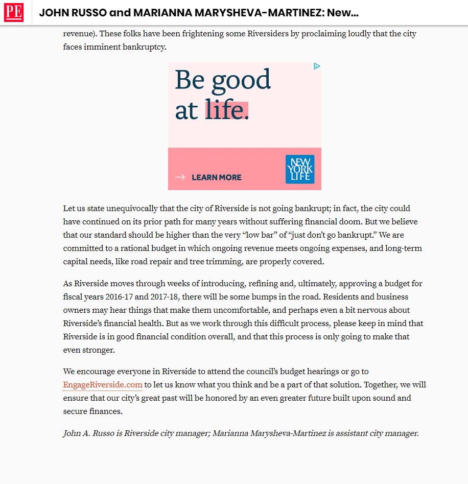 Unfortunately, some perennial critics of the city have confused the cure (early diagnosis of future budget challenges) with the disease (a negative imbalance between ongoing expenses and ongoing revenue). These folks have been frightening some Riversiders by proclaiming loudly that the city faces imminent bankruptcy.