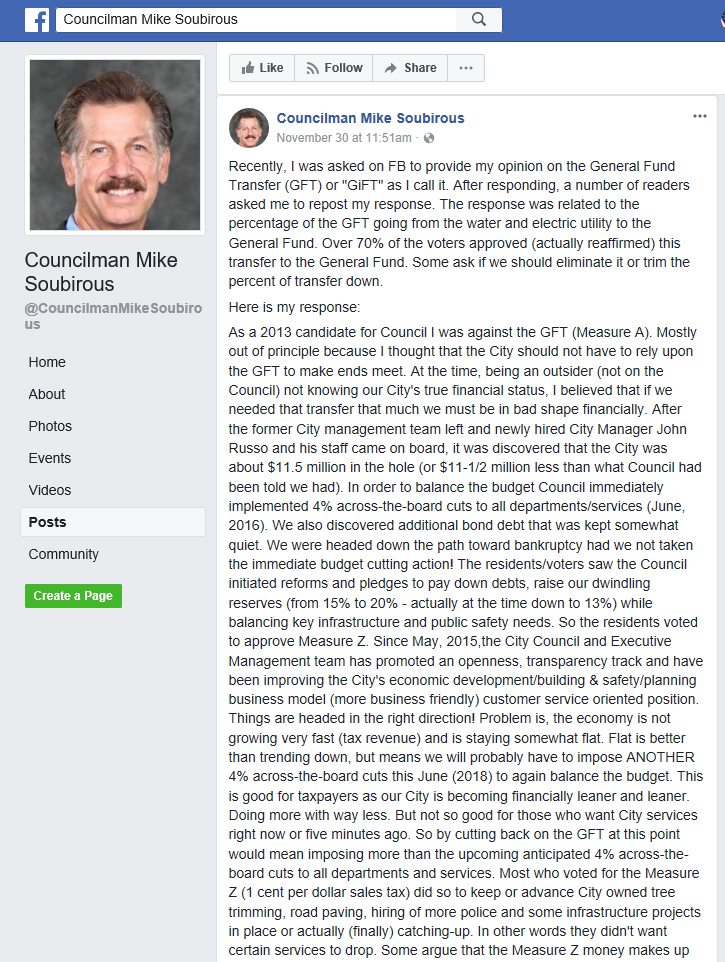 As a 2013 candidate for Council I was against the GFT (Measure A). Mostly out of principle because I thought that the City should not have to rely upon the GFT to make ends meet. At the time, being an outsider (not on the Council) not knowing our City’s true financial status, I believed that if we needed that transfer that much we must be in bad shape financially. After the former City management team left and newly hired City Manager John Russo and his staff came on board, it was discovered that the City was about $11.5 million in the hole (or $11-1/2 million less than what Council had been told we had). In order to balance the budget Council immediately implemented 4% across-the-board cuts to all departments/services (June, 2016). We also discovered additional bond debt that was kept somewhat quiet. We were headed down the path toward bankruptcy had we not taken the immediate budget cutting action!
