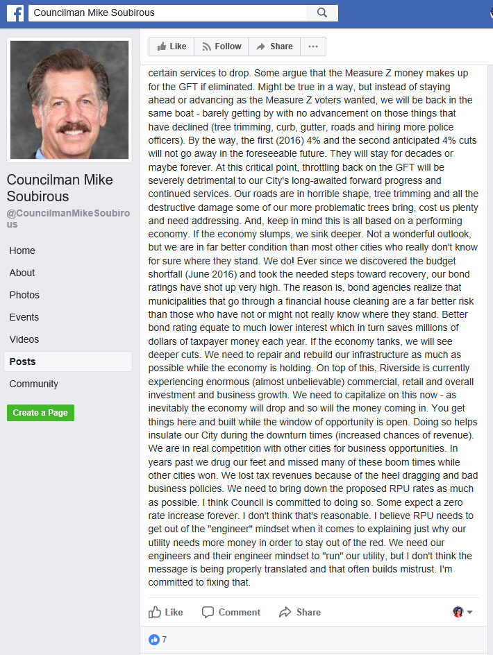 So who are we to believe regarding the financial condition of the City of Riverside in 2016? Staff prior to the passage of the Measure Z ballot measure, a $50+ million new annual sales tax; or an elected official afterwards? Well neither, of course! Butttttttttt, neither were technically (fingers crossed) lying either…the key word being “imminent” when it came to the timing of bankruptcy.
