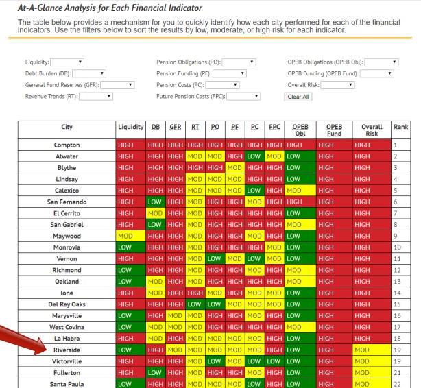 ACCORDING TO THE CALIFORNIA STATE AUDITOR’S FISCAL HEALTH OF THE STATES OVER 470’S CITIES: THE CITY OF RIVERSIDE IS IN THE TOP 5TH PERCENTILE OF FISCALLY CHALLENGED CITIES: Residents should absolutely be concerned. The purpose of this online dashboard by the State of California is part of their high-risk local government agency audit program to identify cities that could be facing fiscal challenges by assessing their levels of risk using various financial indicators. Through this transparent interface, California residents, state and local policymakers, and interested parties will have a data driven view of each city’s risk assessment. Riverside is the 19th worst in the State…think about that the next time you get one of 14-year Councilman Andy Melendrez’s propaganda pieces for Mayor touting what a great job he’s done. Phooey!