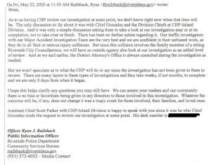 UPDATE 10/20/2020: It seems we’ve stirred the pot enough to embarrass the Press Enterprise into finally writing a follow-up story. Our favorite part? “Riverside police spokesman Officer Ryan Railsback said that review took place in a meeting between police and CHP officials, and the CHP verbally agreed with the findings. Railsback said no written record of the CHP’s conclusion was produced.” The CHP won’t even formally sign off on the findings! RPD just broke our bullshit detector! We might have to file a claim for damages for intentional infliction of emotional distress.