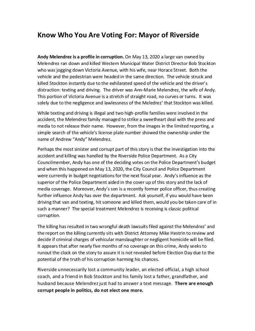 Yes dear readers, despite RPD policy detailing the option available to immediately request assistance from the California Highway Patrol, specifically for the investigation of a traffic collision involving a City official where a fatality has occurred, no request from CHP to takeover the investigation was made despite the CHP Multidisciplinary Accident Investigation Team only being 20 minutes away (and similar County services in the vicinity as well). And now serious questions must be asked as to the independence of the investigation into the death of Stockton given the gross conflicts-of-interest present on behalf of RPD and the deep family ties of the Melendrez family within the Department.