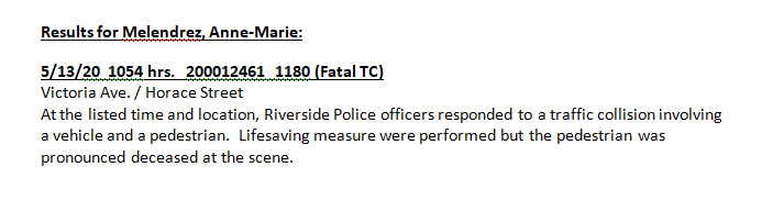 FATAL INJURY TRAFFIC COLLISION Riverside, CA – On Wednesday, May 13, 2020, at approximately 10:54 a.m., the City of Riverside’s Public Safety Communications Center received calls of a traffic collision involving a vehicle and pedestrian on Victoria Avenue near Horace Street. Paramedics with the Riverside Fire Department and Riverside Police Officers responded and located the parties involved on westbound Victoria Avenue, between Lincoln Avenue and Horace Street. Lifesaving measures were performed but the pedestrian was pronounced deceased at the scene.