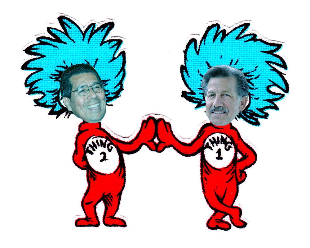 Bosom buddies Melendrez and Soubirous seen high-fiving over costing the taxpayers nearly a million dollars in legal fees over the Russo contract, which was later determined to be invalid. Good job Thing 1 and Thing 2!