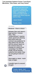 These transmittal sheets show the legal opinion of our City Attorney’s office during the approval process of the three Charter Officers contracts, the last time they had been extended. Hunter notes, out of the three transmittal sheets, only Russo’s has two timestamps, one of them the day AFTER the contract had already been approved. He points out what was changed: the word “Mayor” is scrawled out in the comments section as to who HAS to execute the contract. And whose name is on this transmittal sheet? Yes, dear readers, our current City Attorney’s, Gary G. Geuss. In fact, checking the video from the night of the contract’s passage (and subsequent veto attempt), Geuss lets us know exactly what he’s going to do as far as changing his legal opinion after-the-fact: