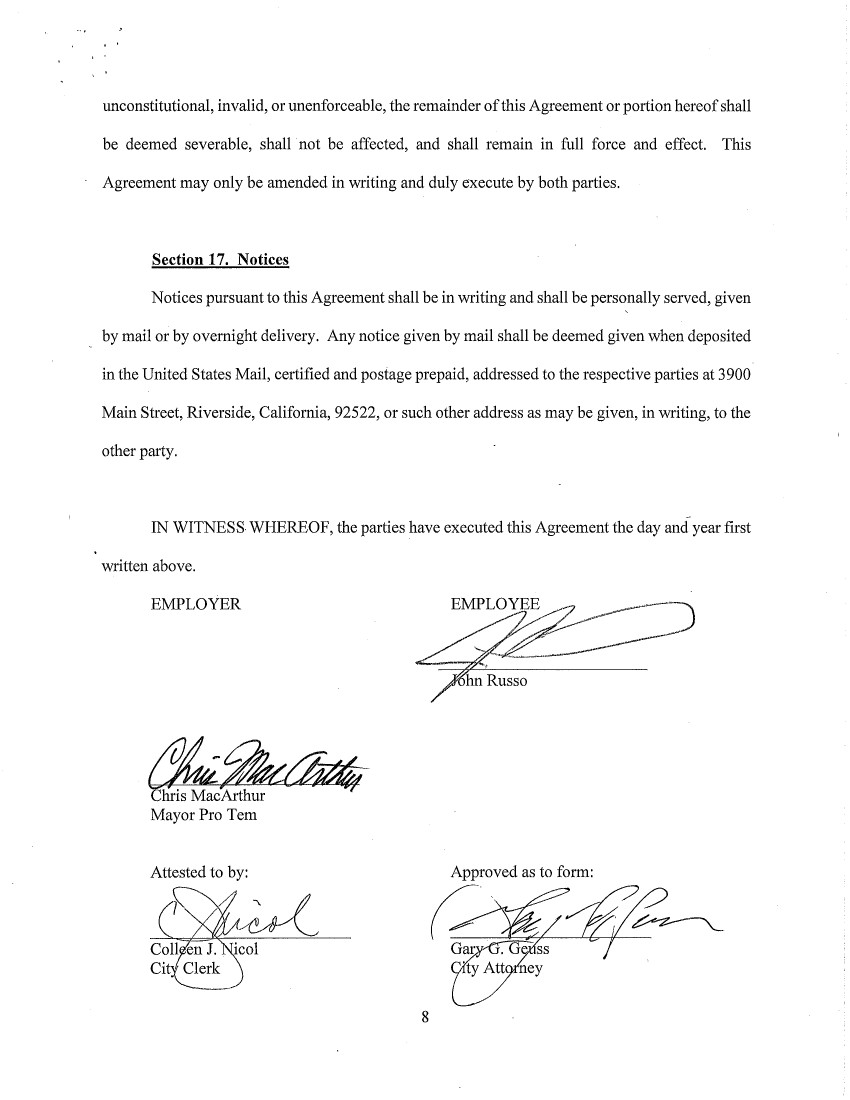 I would indicate that the contract signed by myself and by Mr. Russo be forwarded to the [Mayor] Pro Tem for his signature and the City Clerk for her attestation. And that is the only thing that is required to make this contract a legal and binding contract.”