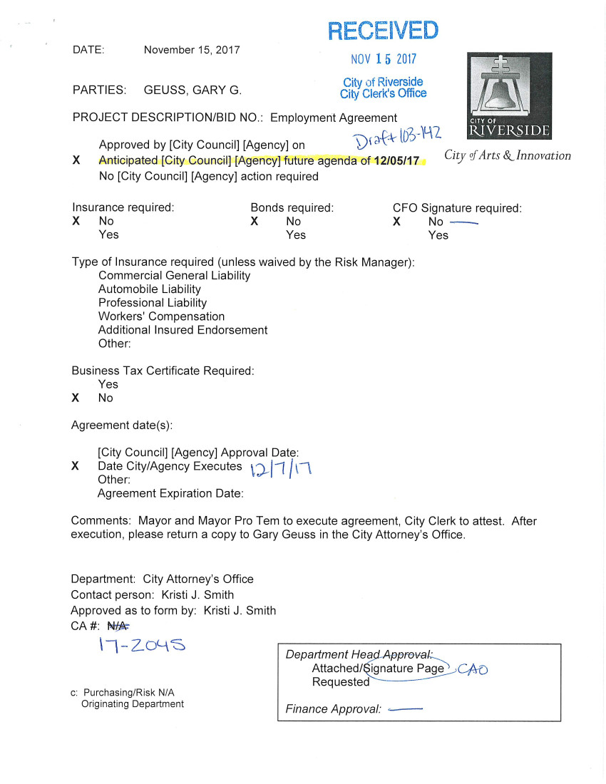 So where are we now and where do we go from here? According to Geuss’ whine/complaint against the City (see below), almost A YEAR after Hunter brought damning evidence of forgery and named Geuss as the perpetrator, the new City Council (sworn in last December) finally put Geuss on administrative leave to investigate his claims. In the interim, Riverside Superior Court ruled against the City in determining the Russo contract was invalid, as Mayor Bailey had the right to veto the extra provisions in the new contract, even though the resolution appropriating those provisions was never brought forward as it should’ve been.